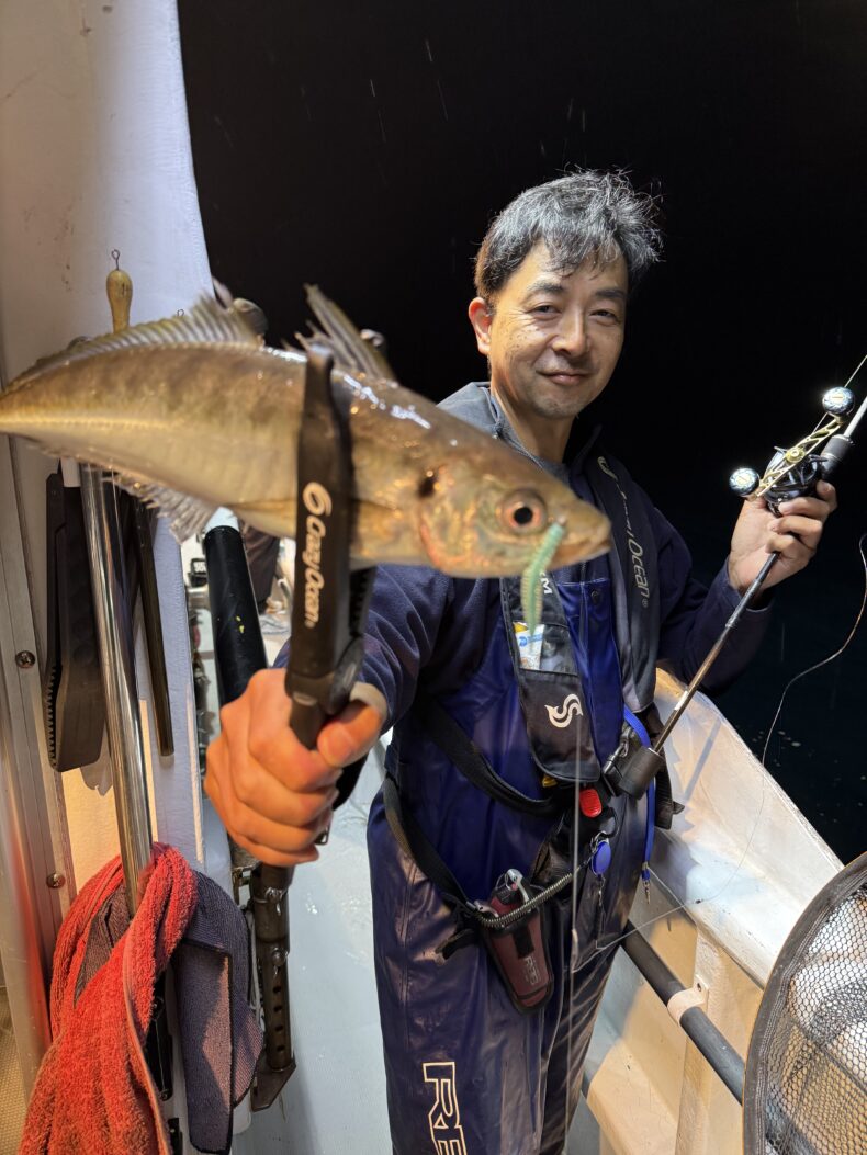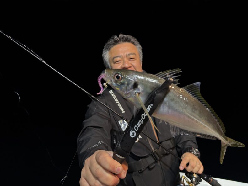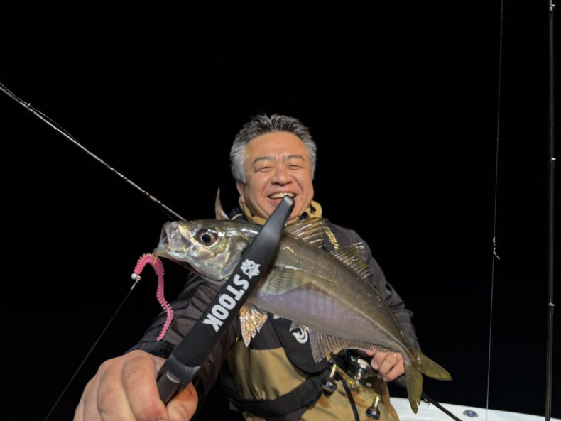 集魚灯を点けしばらくすると謎のベイトが中層〜ボトムにパラパラと出始めるとポツリ…ポツリと当たり始め✨