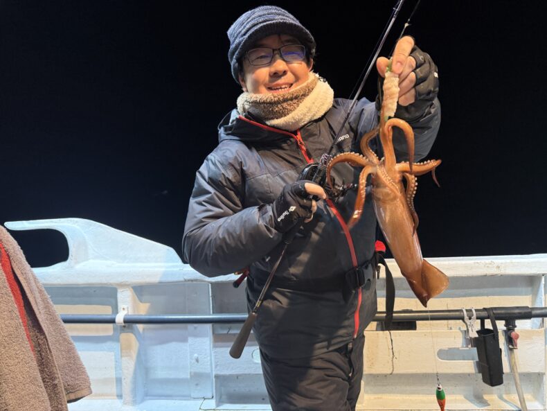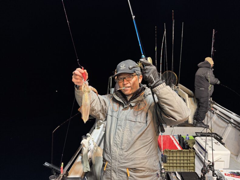 集魚灯を点けしばらくするとケンサキ&スルメがポツリ…ポツポツと当たり始め😮💨✨