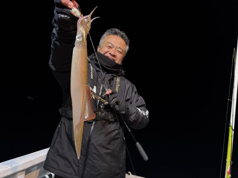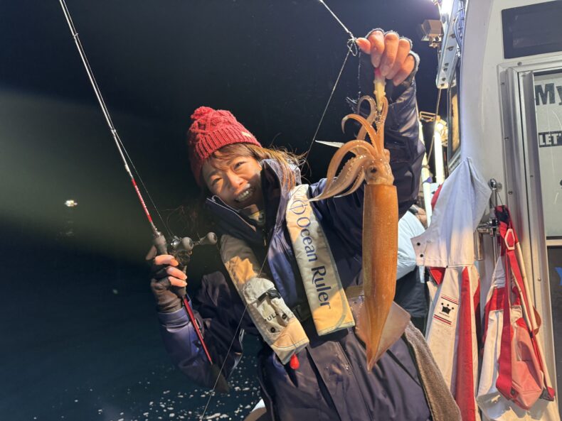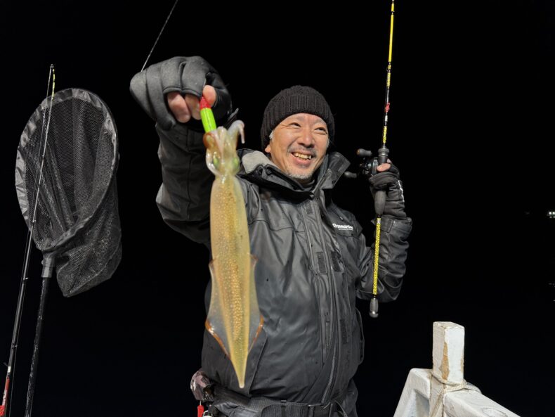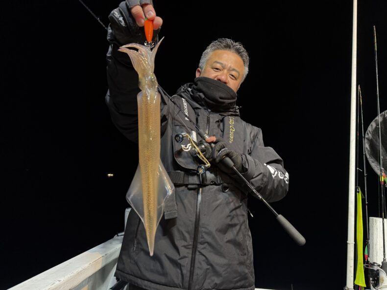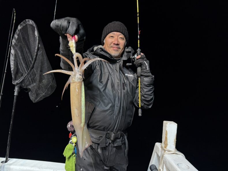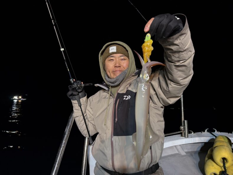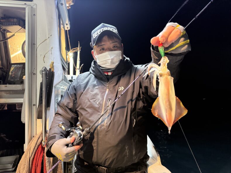 集魚灯を点けしばらくしてケンサキ&スルメイカがポツリ…ポツポツと当たり始め✨