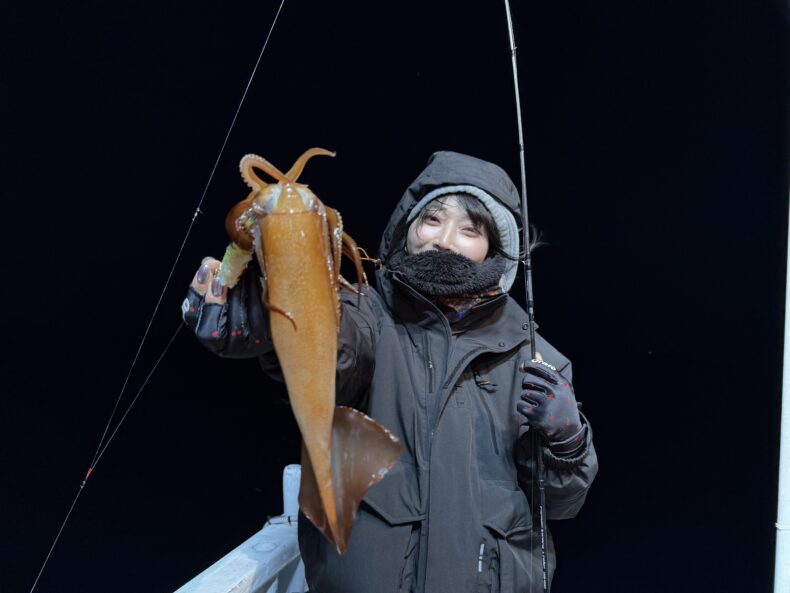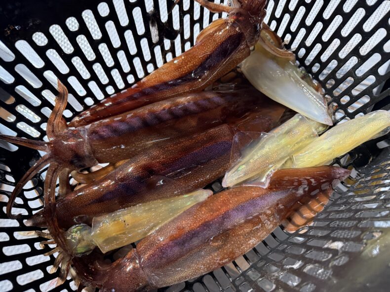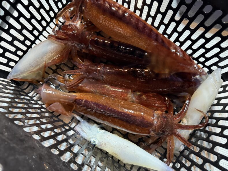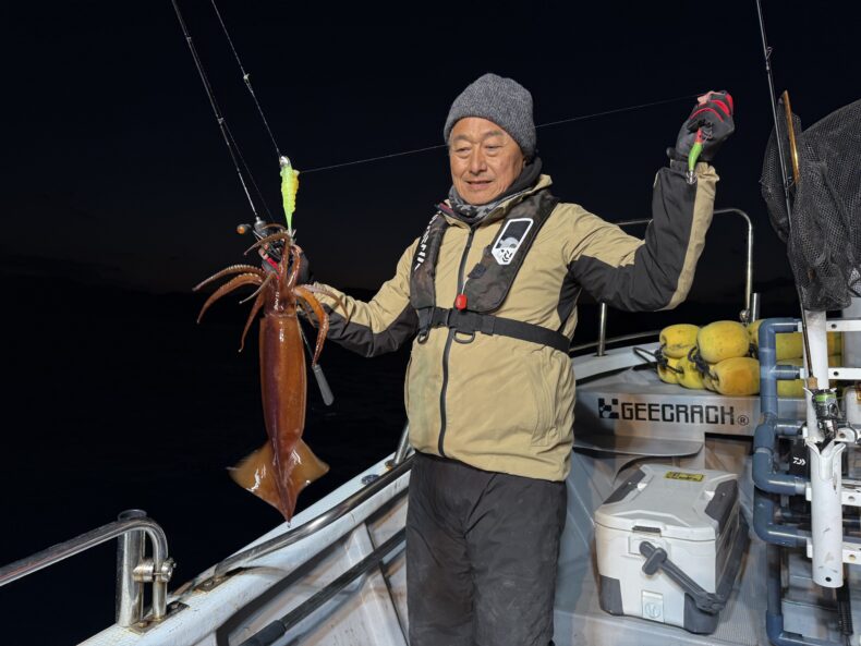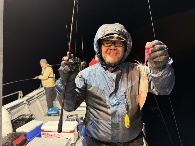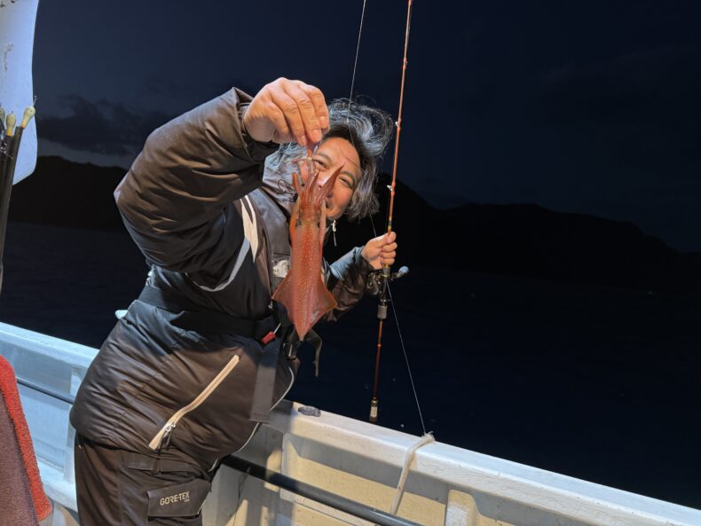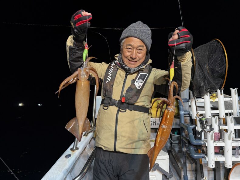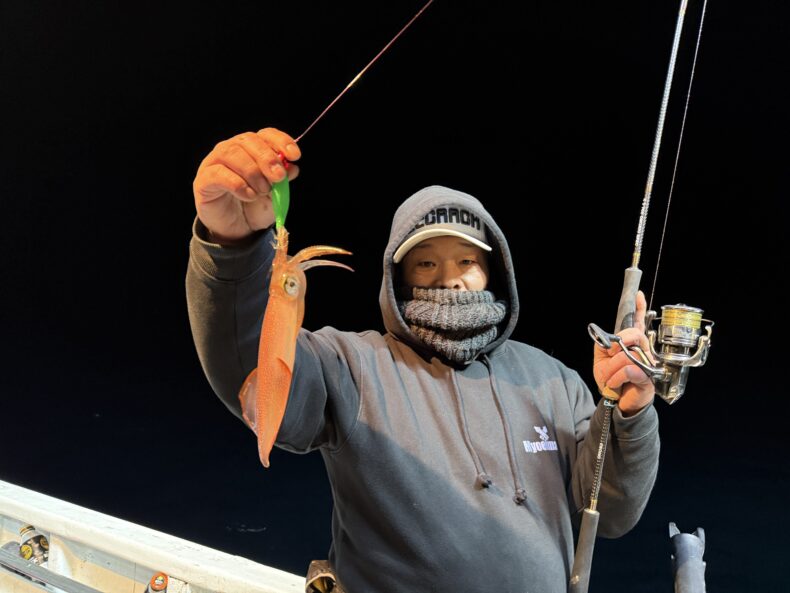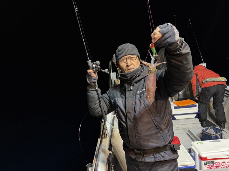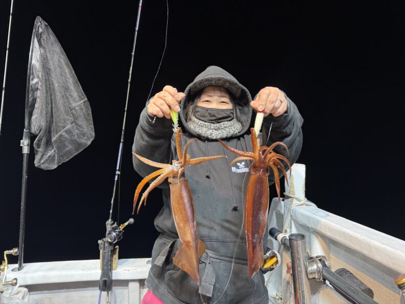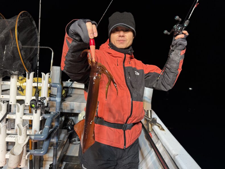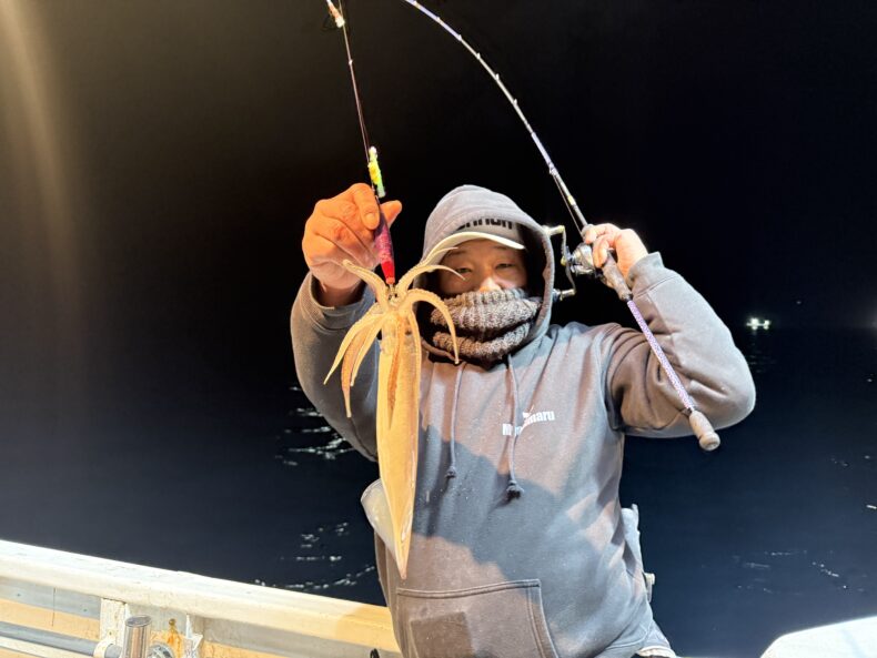 集魚灯を点けしばらくして反応が出始めるとスルメ&ケンサキがバタバタと当たり始め😮💨