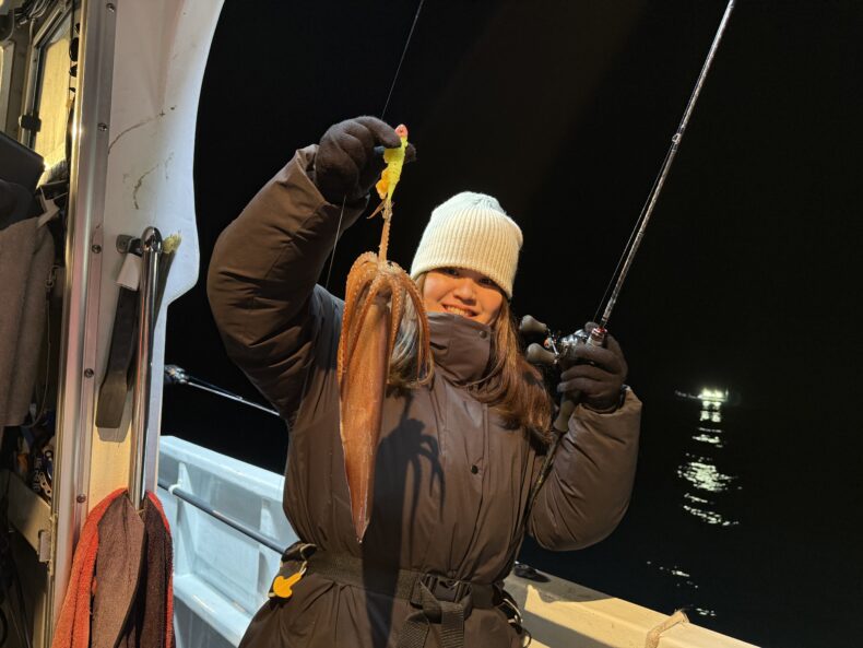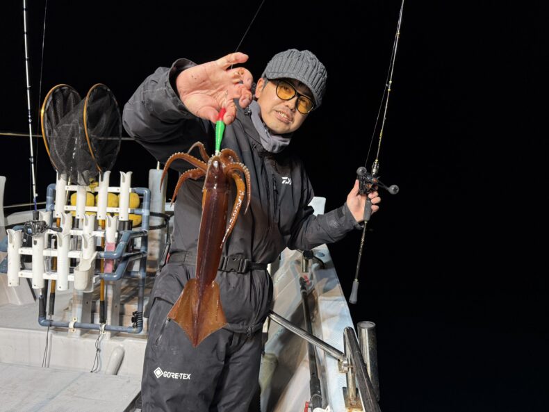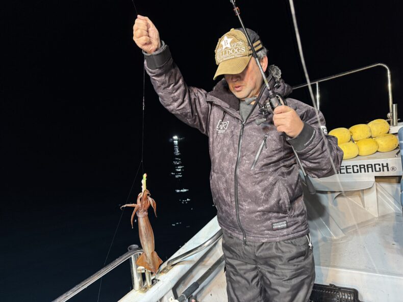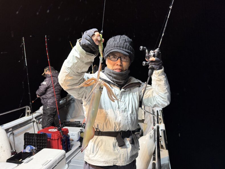 集魚灯を点けしばらくして明るい時間帯からヤリイカがバタバタと当たり始めましたが後続かず…