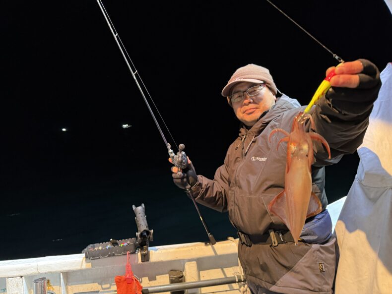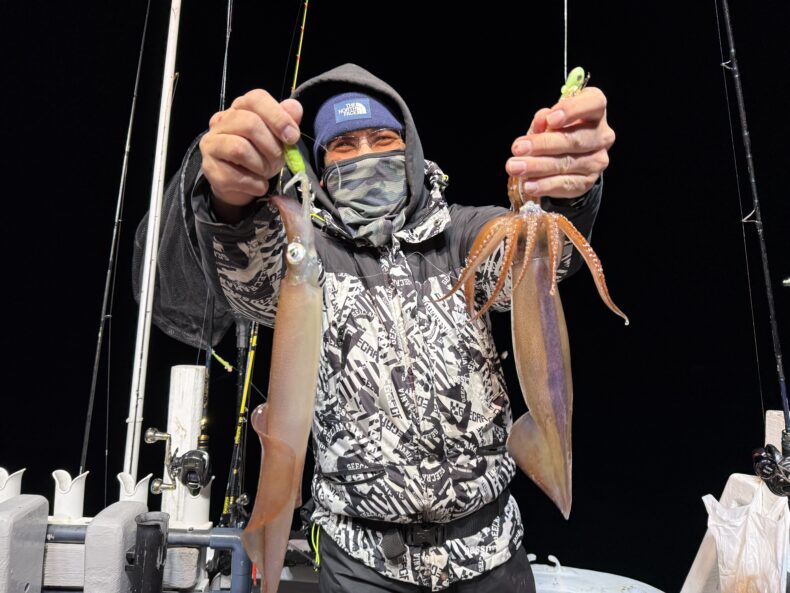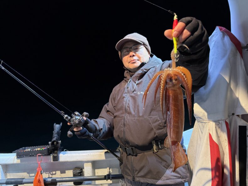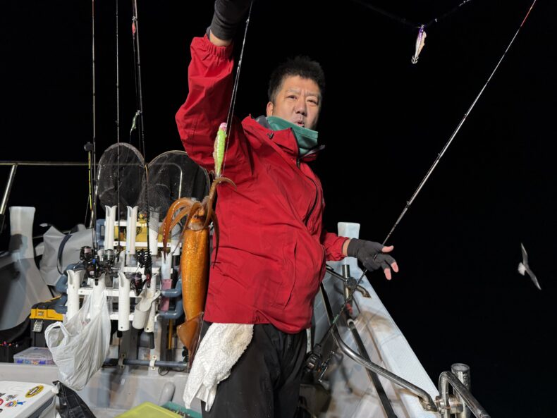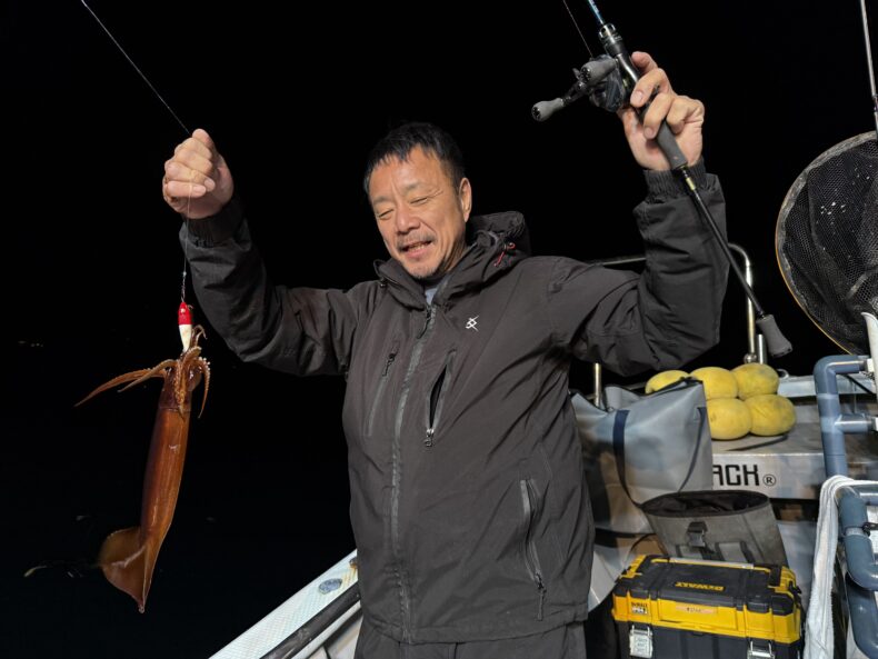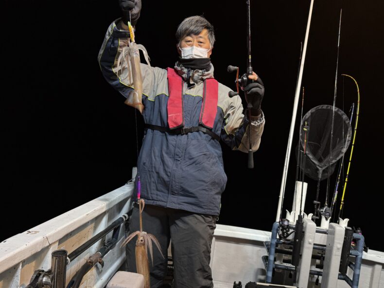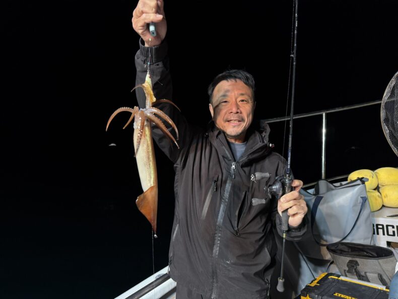 集魚灯を点けしばらくしてスルメ&ケンサキがポツリ…ポツポツで後が続かず…