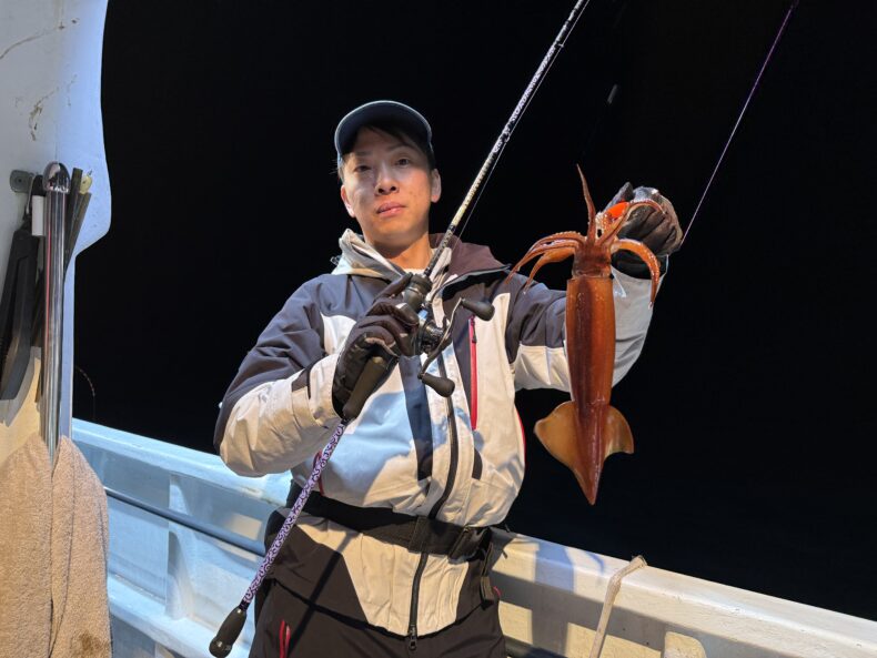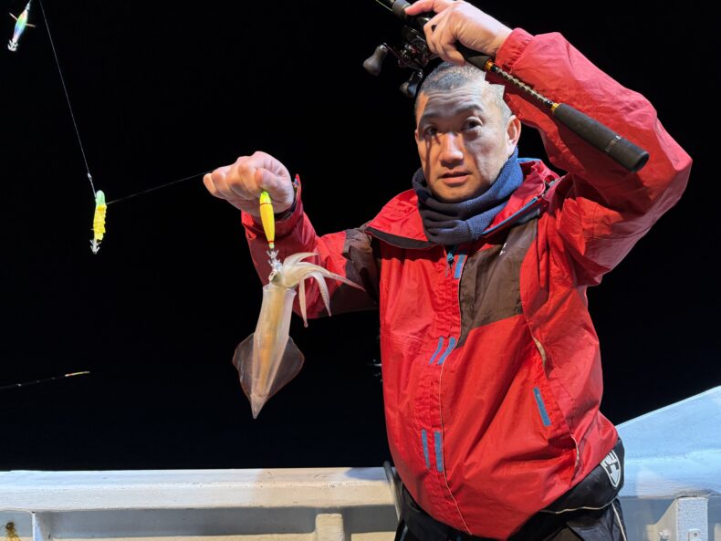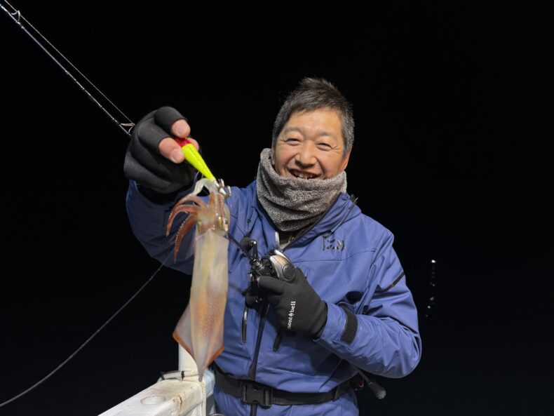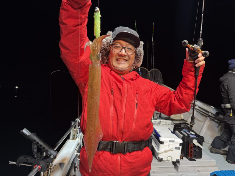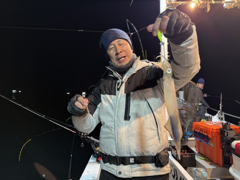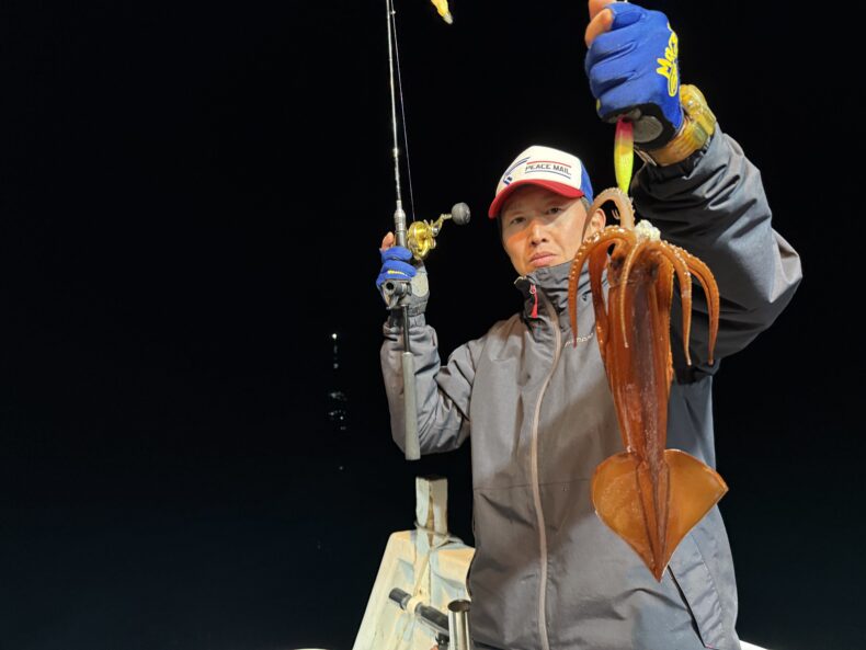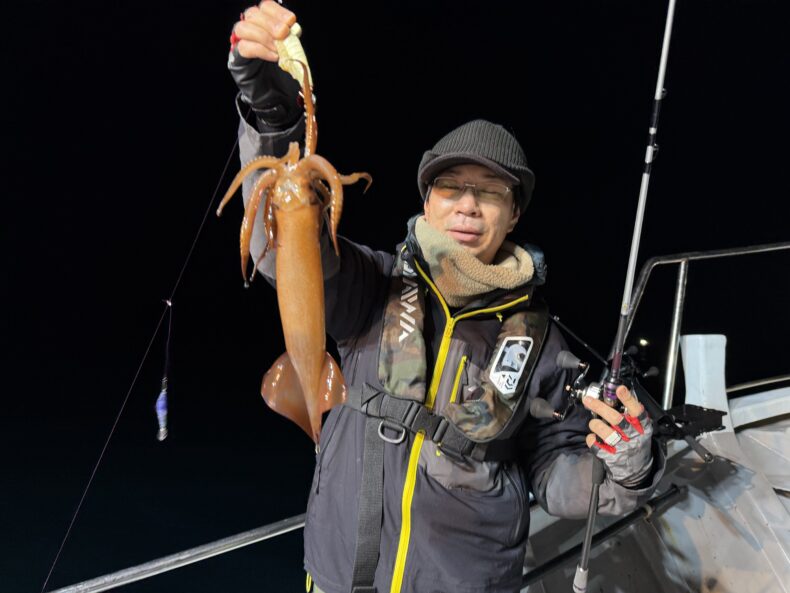 集魚灯を点けしばらくしても中々ベイトの反応も悪くケンサキ&スルメがポツリ…ポツポツと当たり始めましたが後が続かず…
